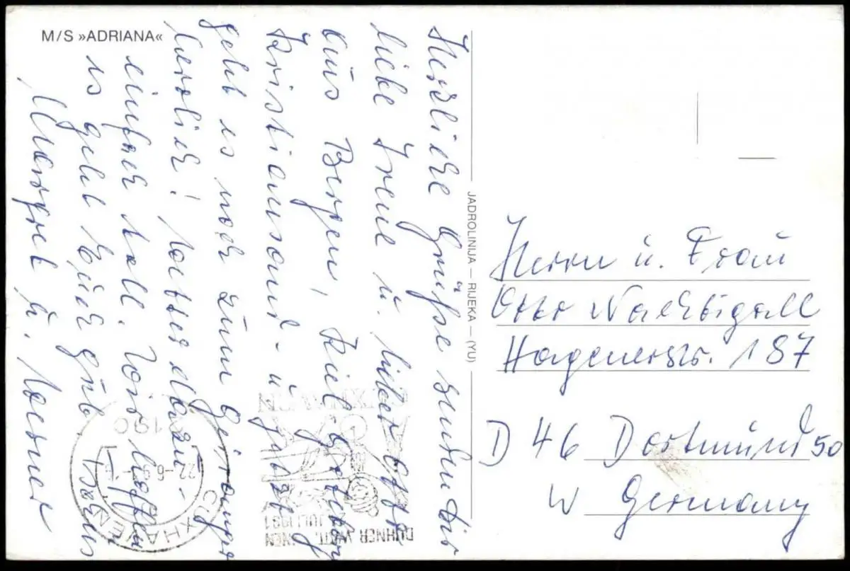 ÄLTERE POSTKARTE M/S ADRIANA MS MOTORSCHIFF FÄHREVerlag: Jadrolinija, RijekaGelaufen: 22.06.1991 mit Stempel Cuxhaven nach Dortmund, Briefmarke mit Spuren entferntErhaltung (s. Scan): gut - mittel / 916777