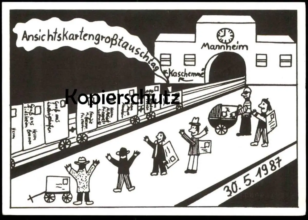 ÄLTERE KÜNSTLER POSTKARTE MANNHEIM ANSICHTSKARTENGROSSTAUSCHTAG 30.05.1987 KASCHEMME ANSICHTSKARTENBÖRSE BAHNWAGGONS IN ANSICHTSKARTENFORM BESCHRIFTET MIT GRUSS AUS LUDWIGSHAFEN GRUSS AUS SINSHEIM TISCHANMELDUNGEN SINSHEIM AK-TAUSCH-KREIS RHEIN-NECKAR MANNHEIMVerlag: unbekannt