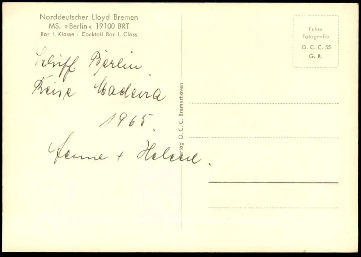 ÄLTERE POSTKARTE M.S. BERLIN NORDDEUTSCHER LLOYD COCKTAIL BAR I. KLASSE Verlag: O. C. C. BremerhavenGelaufen: nein, handschriftlich beschriftet “Schiff Berlin Reise Madeira 1965 Aenne + Helene”Erhaltung (s. Scan): gut - sehr gut / 918003