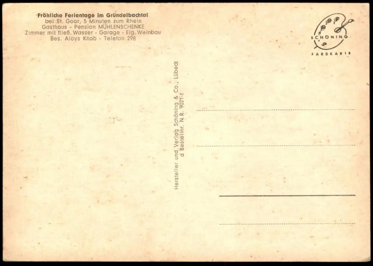 ÄLTERE POSTKARTE GASTHAUS MÜHLENSCHENKE PENSION WEINGUT ALOYS KNAB GRÜNDELBACH ST. GOAR GRÜNDELBACHTAL ZIMMER MIT FLIESSEND WASSER, GARAGE, EIGENER WEINBAUVerlag: Schöning & Co., Lübeck