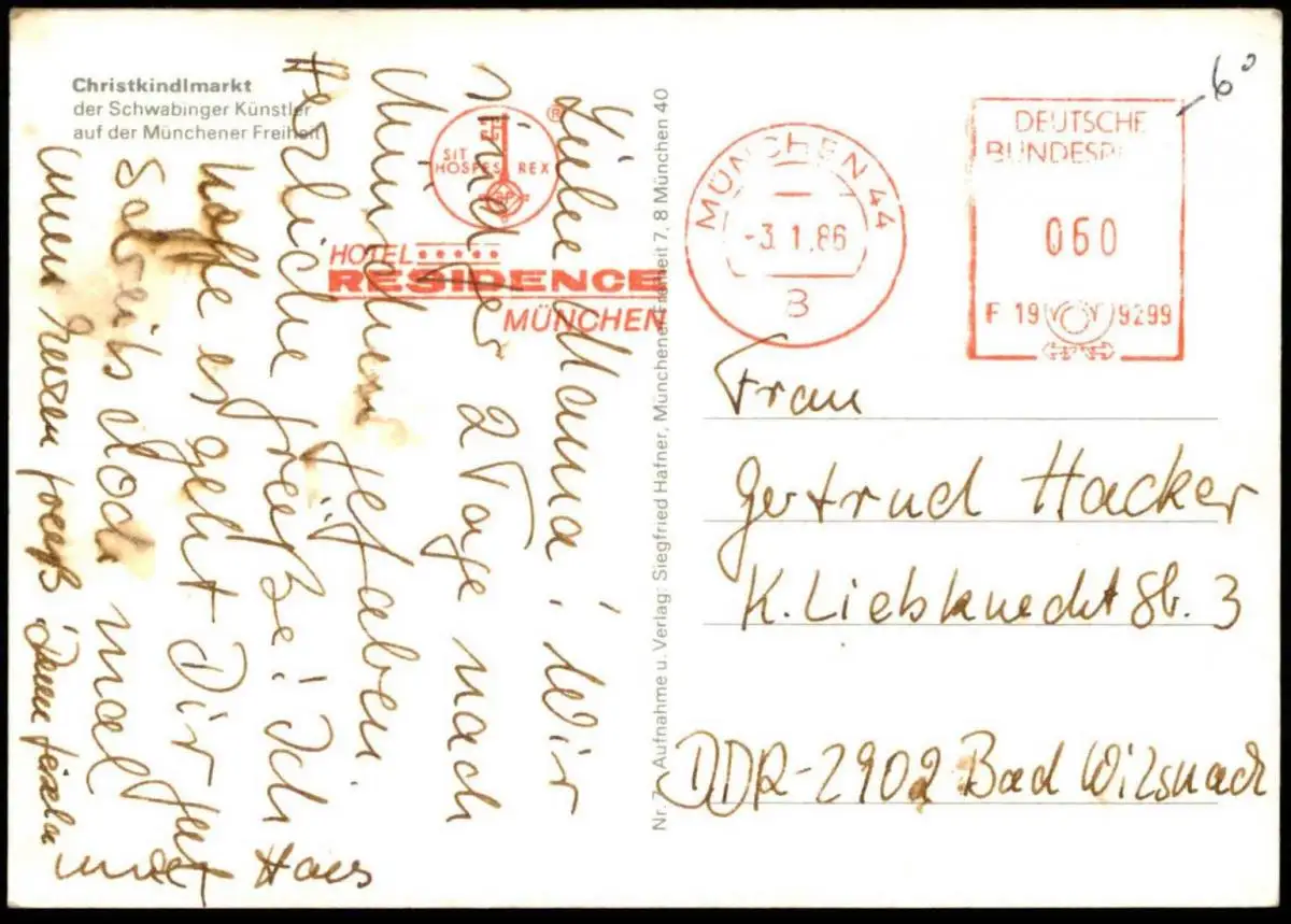 Gelaufen: 03.01.1986 mit Freistempel Hotel Residence Sit Hospes Rex München nach Bad Wilsnack