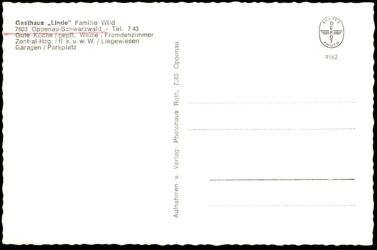 ÄLTERE POSTKARTE OPPENAU GASTHAUS ZUR LINDE FAMILIE WILD ZENTRALHEIZUNG LIEGEWIESE GUTE KÜCHE GEPFLEGTE WEINE GARAGEN PARKPLATZVerlag: Photohaus Roth, Oppenau