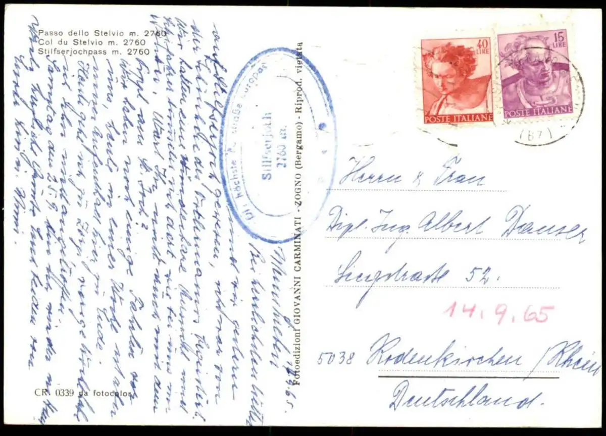 ÄLTERE POSTKARTE PASSO DELLO STELVIO STILFSERJOCHPASS KARMANN GHIA VW KÄFER OPELVerlag: Giovanni Carminati, Zogno BergamoGelaufen: 14.09.1965 nach RodenkirchenErhaltung (s. Scan): gut / 918750