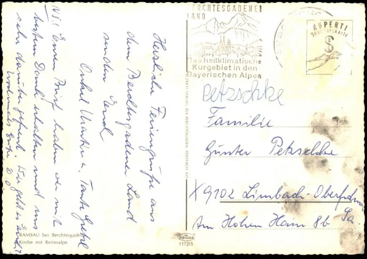 Gelaufen: xx.xx.19xx mit Stempel Berchtesgaden nach Limbach-Oberfrohna, Briefmarke entfernt