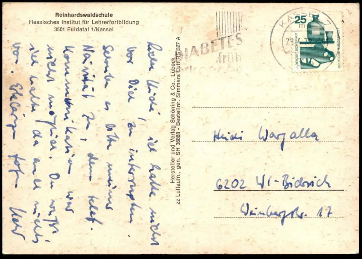 ÄLTERE POSTKARTE REINHARDSWALDSCHULE HESSISCHES INSTITUT FÜR LEHRERFORTBILDUNG FULDATAL KASSEL Ihringshausen Stempel cpa