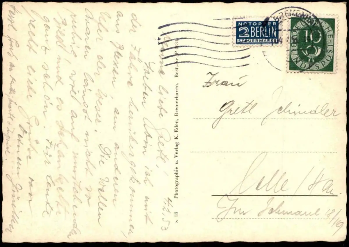 Gelaufen: 04.02.1953 mit Stempel Bremerhaven nach Celle