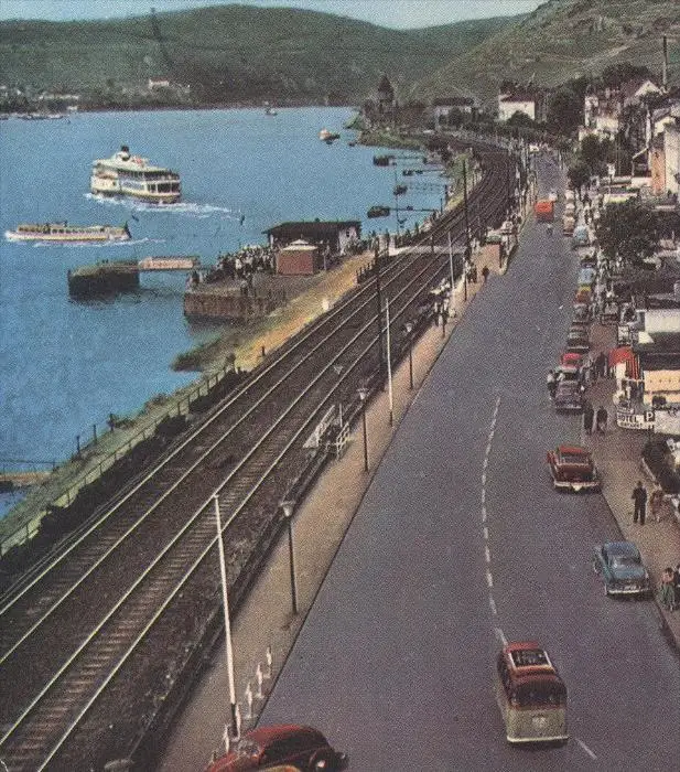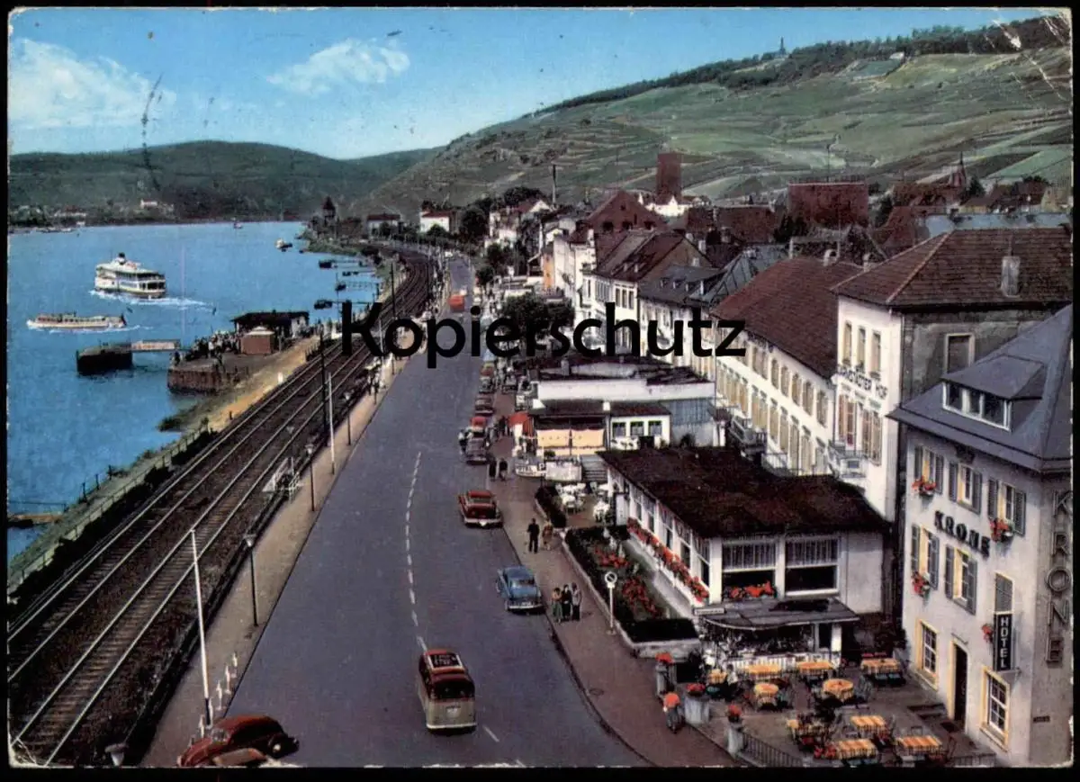 ÄLTERE POSTKARTE RÜDESHEIM RHEINSTRASSE Buick VW Käfer Bahnstrecke railway railroad chemin du fer Ansichtskarte postcard