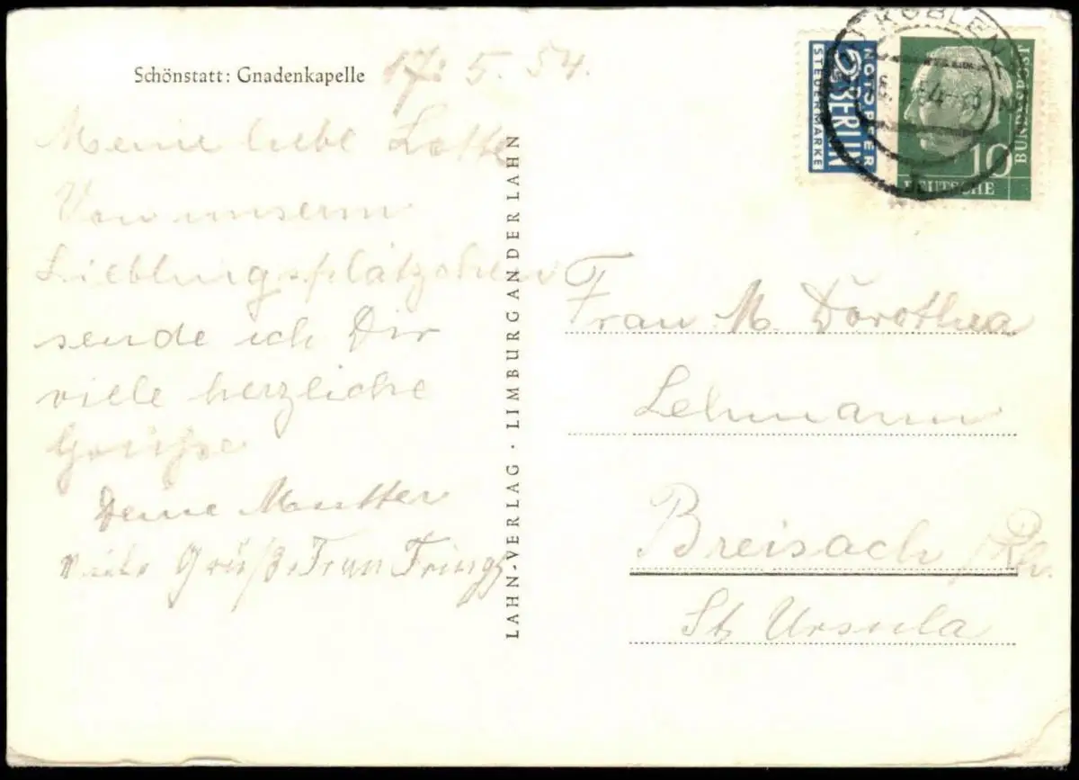 Gelaufen: 18.05.1954 mit Stempel Koblenz nach Breisach St. Ursula