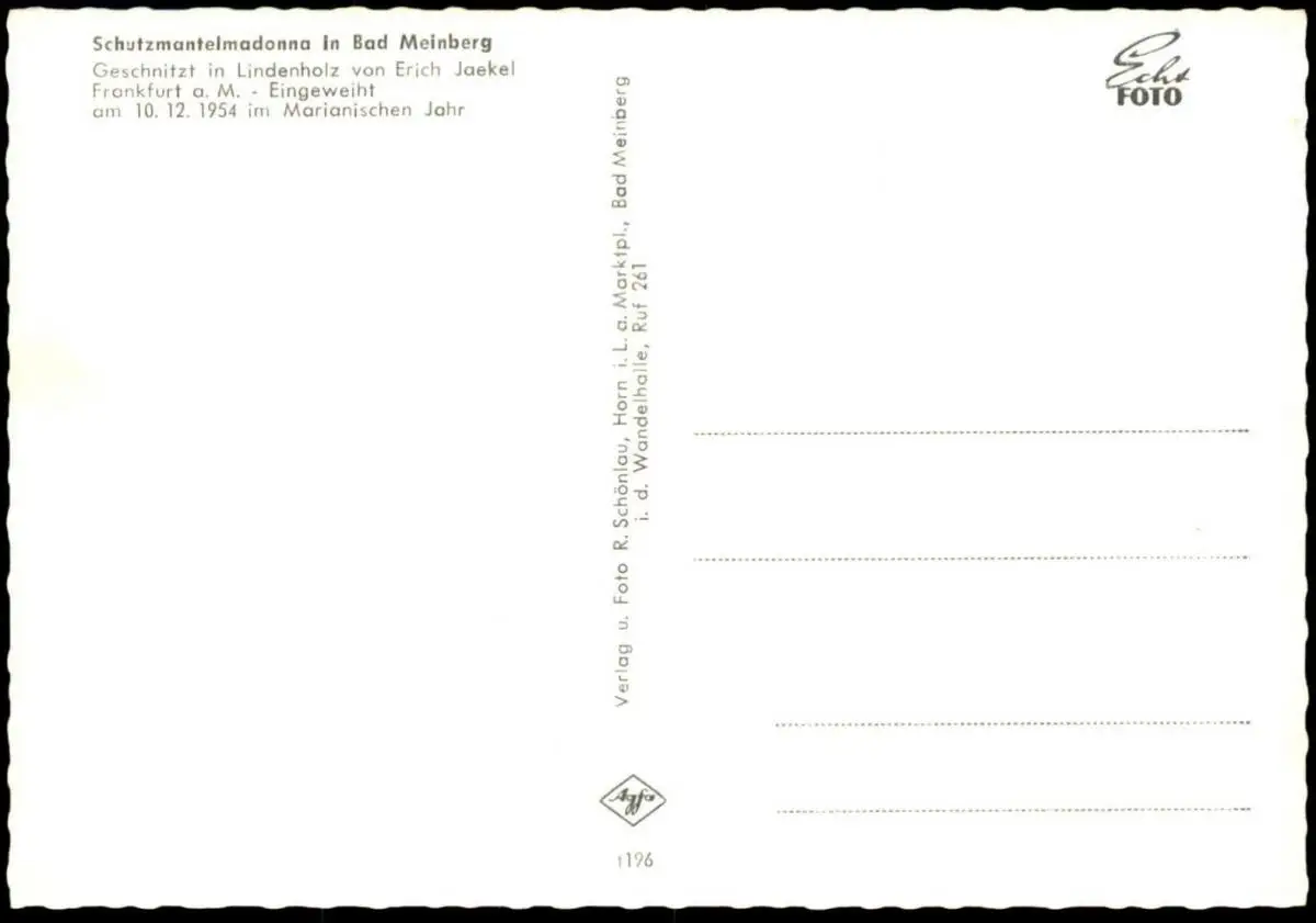 ÄLTERE POSTKARTE SCHUTZMANTELMADONNA BAD MEINBERG LINDENHOLZ GESCHNITZT VON ERICH JAEKEL EINGEWEIHT 10.12.1954Verlag: R. Schönlau, Horn