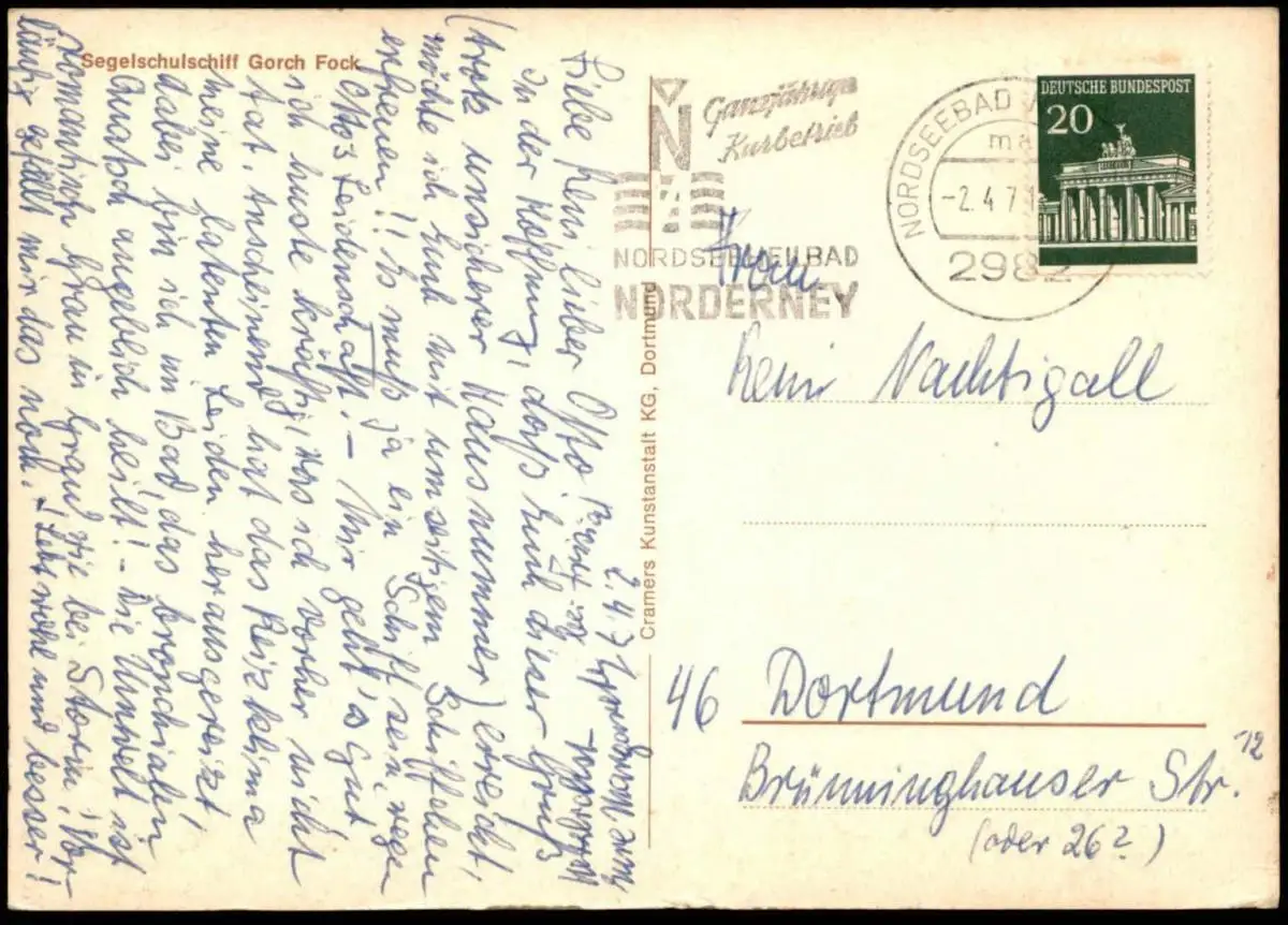 Gelaufen: 02.04.1971 mit Stempel „Ganzjähriger Kurbetrieb Norderney“ nach Dortmund