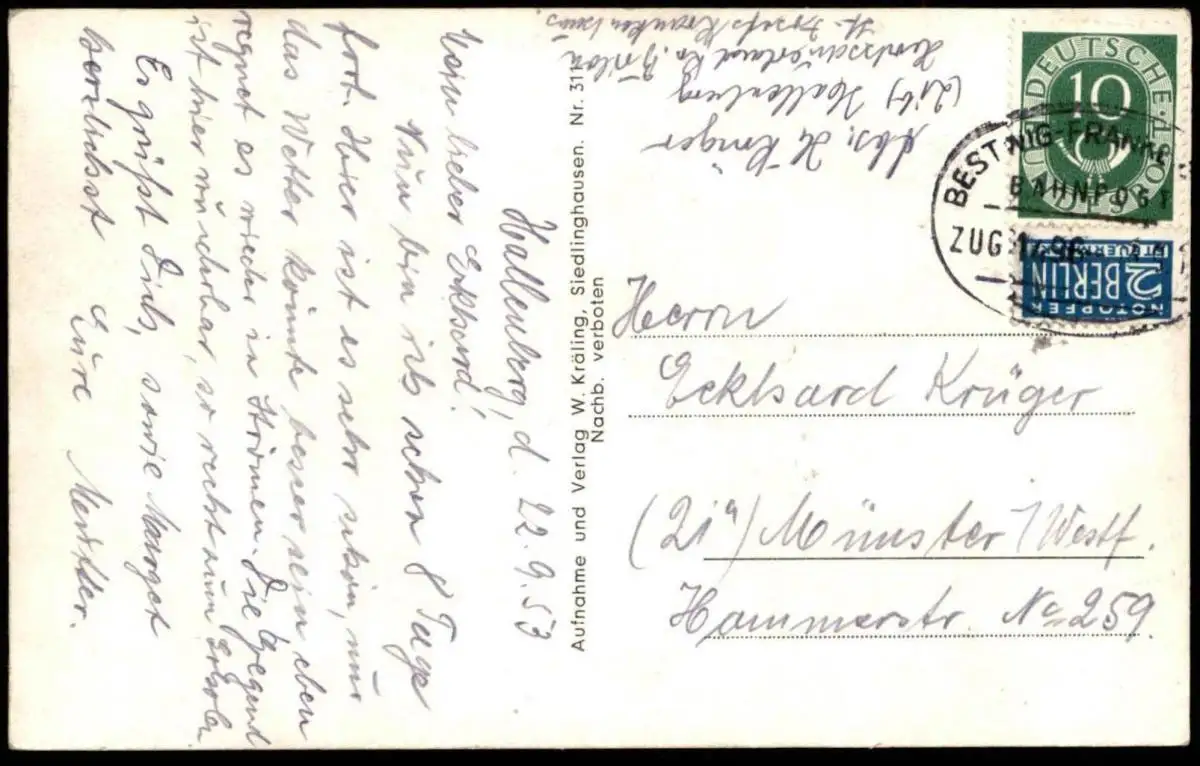 Gelaufen: 22.09.1953 mit Bahnpost-Stempel Zug 1496 Bestwig - Frankfurt nach Münster