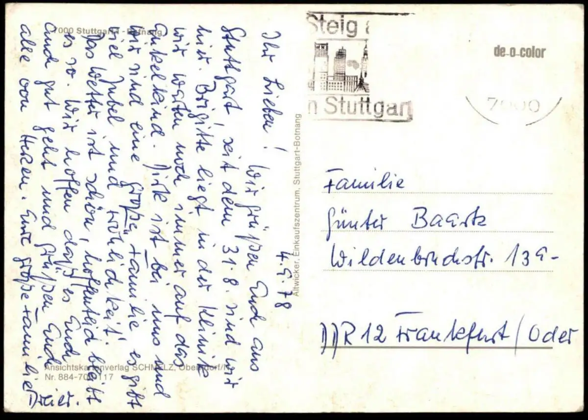 Gelaufen: 04.09.1978 mit Stempel Stuttgart nach Frankfurt Oder, Briefmarke (sauber) entfernt