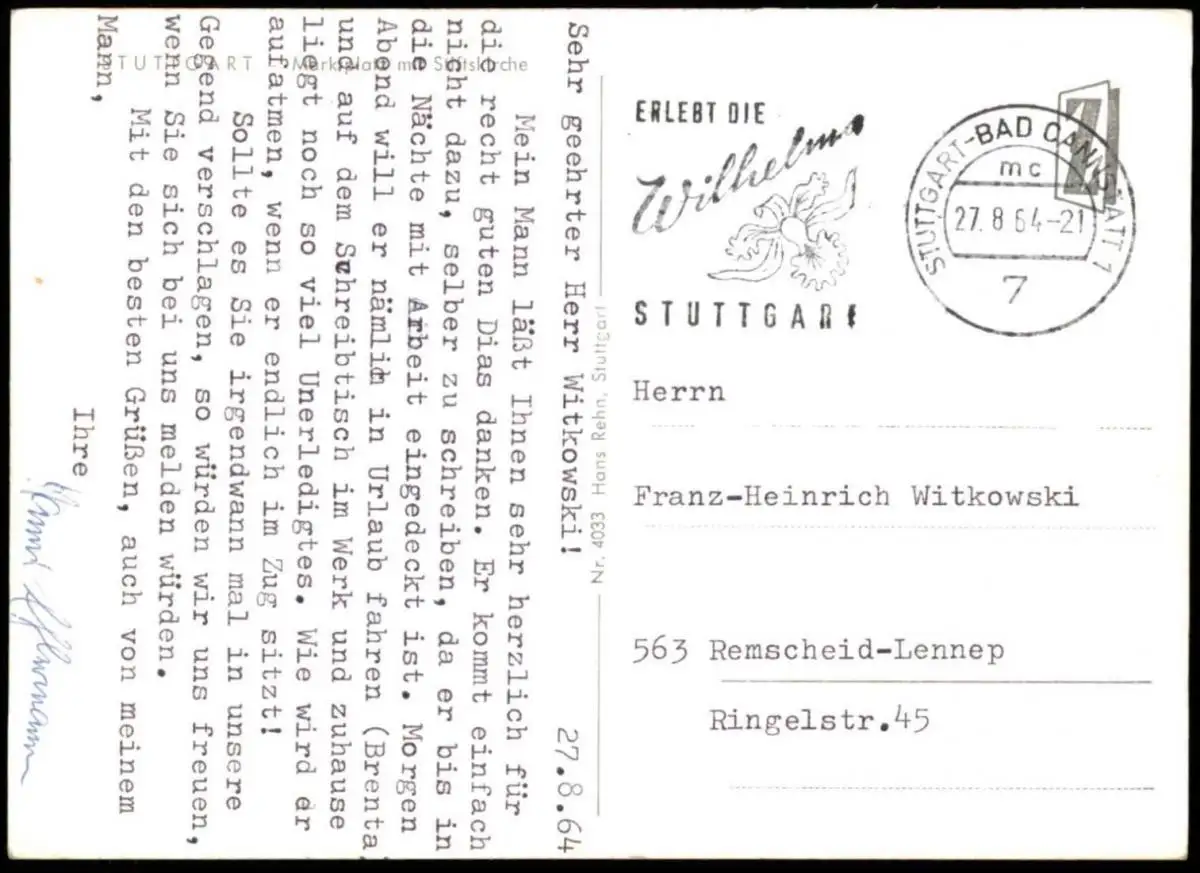 Gelaufen: 27.08.1964 mit Stempel Stuttgart Bad Cannstatt - Erlebt die Wilhelma - Motiv Orchidee - nach Remscheid Lennep