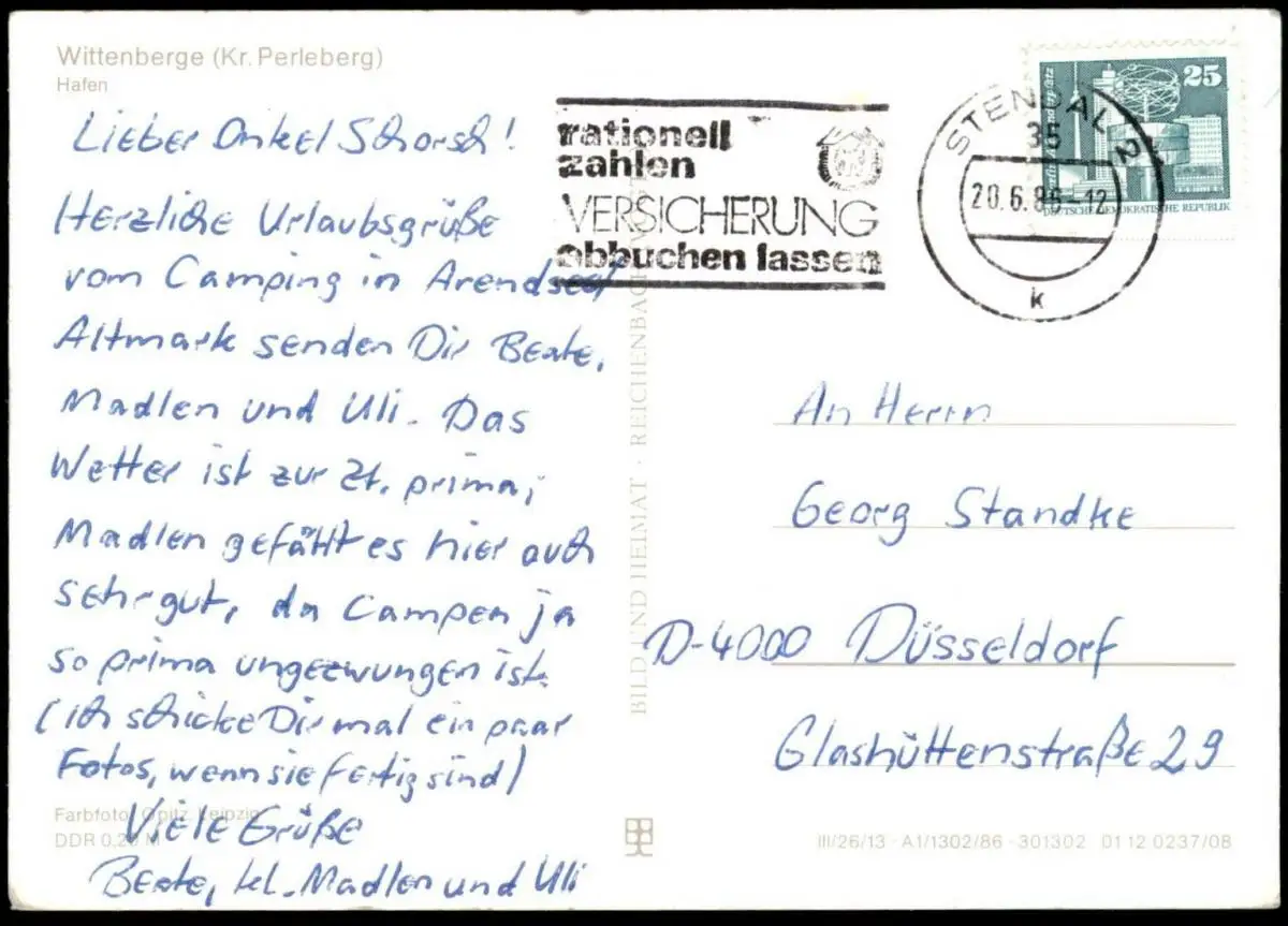 Gelaufen: 20.06.1986 mit Stempel Stendal 2 „rationell zahlen Versicherung abbuchen lassen“ nach DüsseldorfErhaltung (s. Scan): gut, Ecken leicht bestoßen / 918222