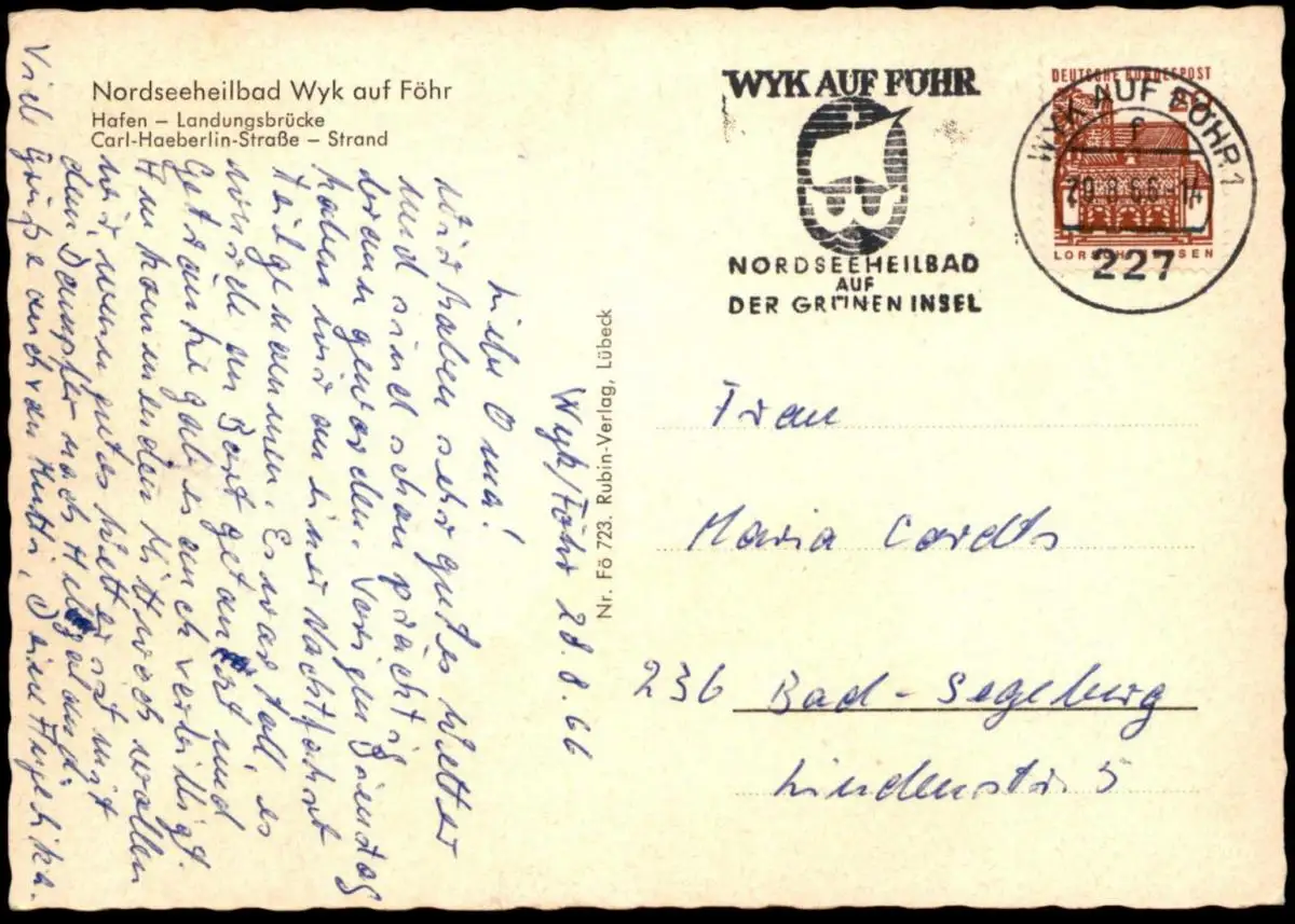 Gelaufen: 29.08.1966 mit Stempel Wyk nach Bad Segeberg
