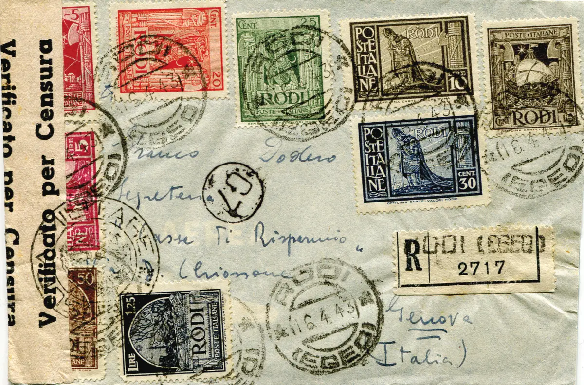 Ägäis - Malerische Lire 5 Verzahnung 11 auf Umschlag Umschlag - Ägäis - Malerische Lire 5 Zahnung 11 Nr. 10 + Ergänzungen zur Vervollständigung der Serie, die anderen 8 Werte der zweiten Ausgabe mit der Aufschrift unten Aus. Wertkarten (Nr. 56/62 + 64) auf Umschlag Racc. von Rhodos nach Genua am 16.4.43 - seitlich Kabelbinder Cod. 1140/14
