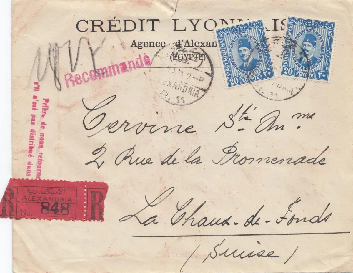 Ägypten/Egypte: 1933: Einschreiben Alexandria in die Schweiz, Perfin