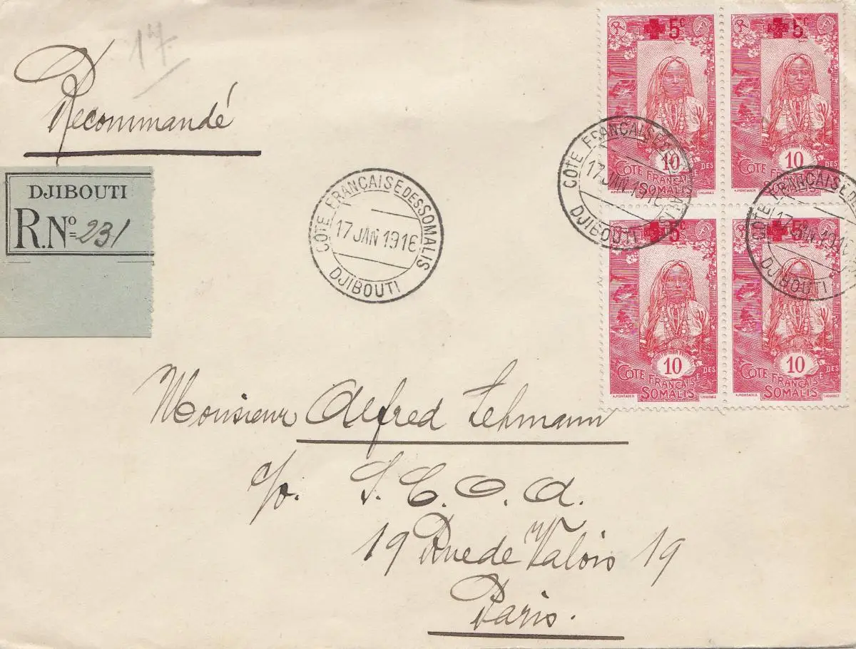 Äthiopien: 1919: Einschreiben Djibouti nach Paris