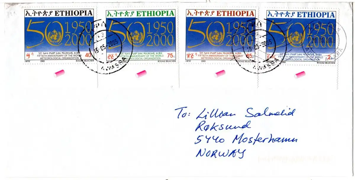 Äthiopien 2005, 4 Werte Meteorologie auf Brief v. Awassa n. Norwegen.