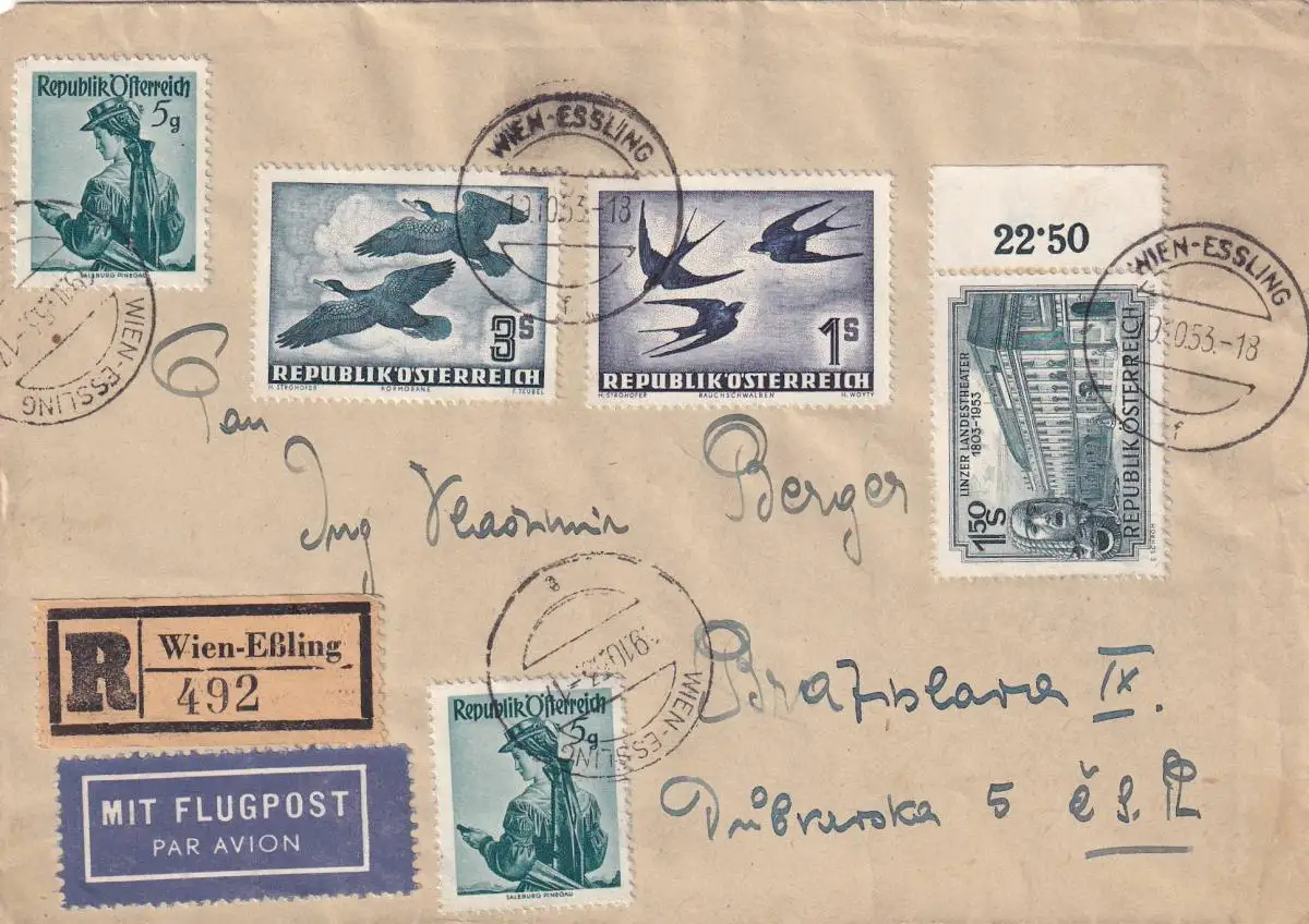 Air mail Einschreiben 1953 Wien Eßling nach Bratislava