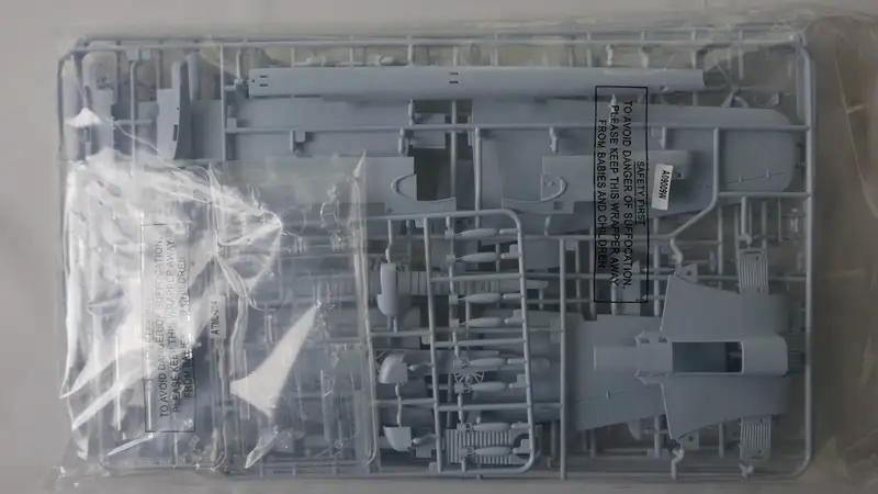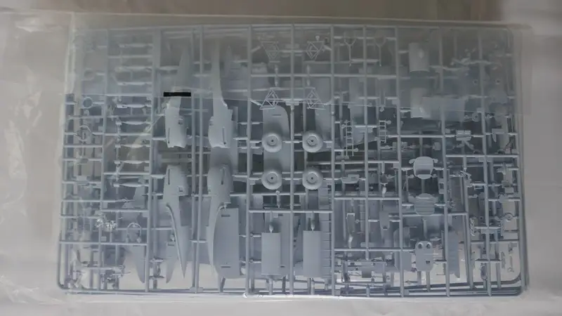 Einzelteile (Plastikbauteile) sind noch am Rahmen fixiert, Sichthülle wurde geöffnet.