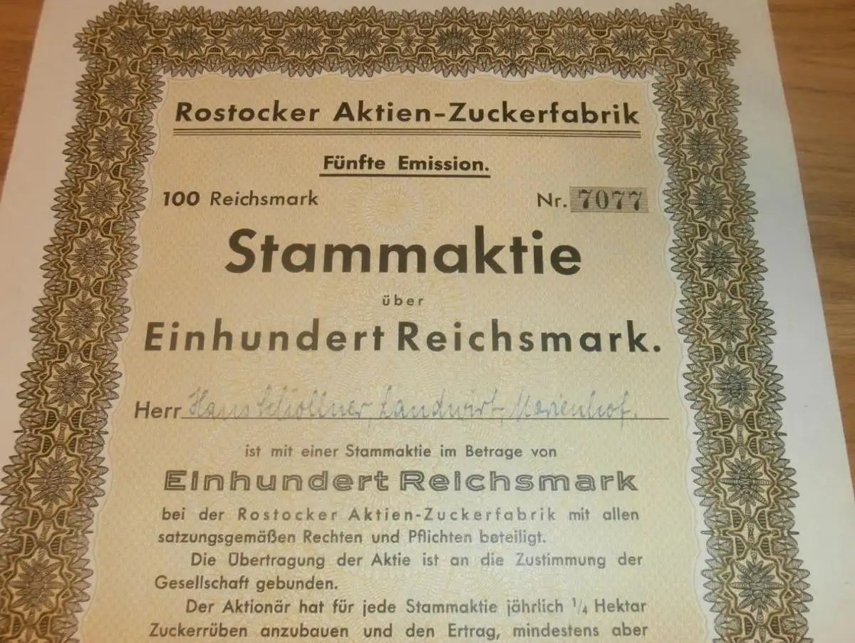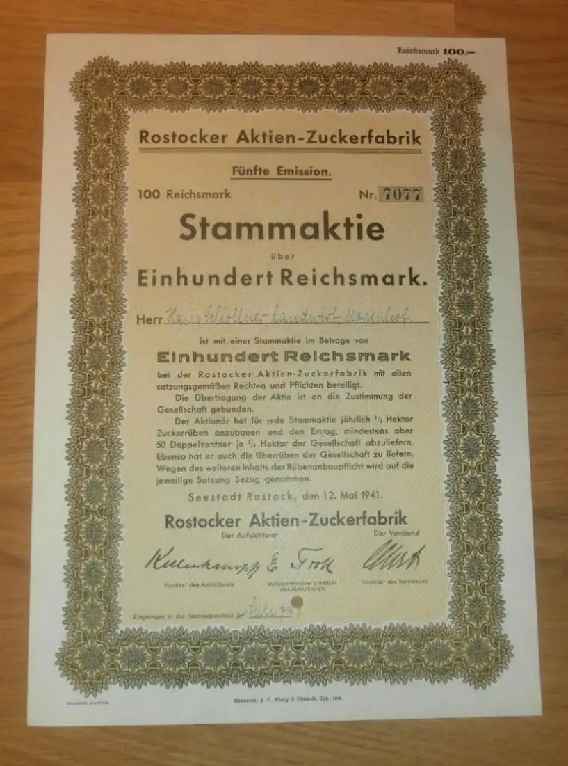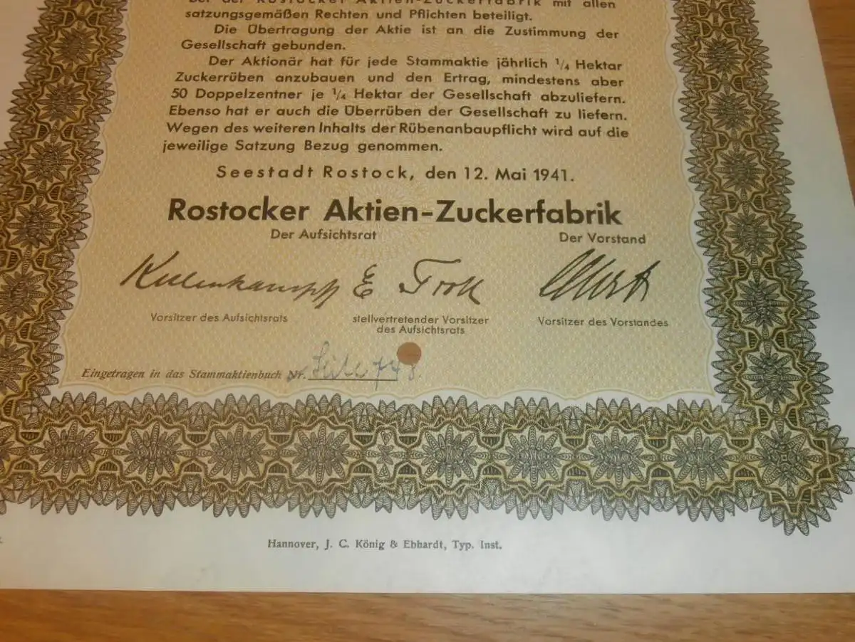 Aktie der Zuckerfabrik Rostock 1941 , Schöllner in Marienhof b. Fincken 100 RM , Mecklenburg !!!