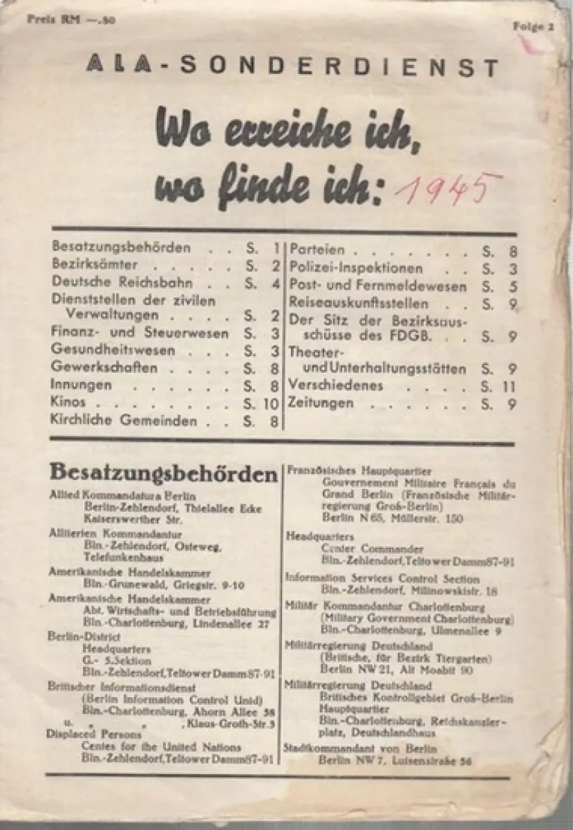 Adressführer durch Gesamt-Berlin nach Kriegsende. Adressen der Besatzungsbehörden-Bezirksämter-Deutsche Reichsbahn-Diensstellen der zivilen Verwaltung-Polizeiinspektionen-Finanz- und Steuerwesen-Gesundheitswesen-Gewerkschaften-Innungen-Kinos-Kirchliche Gemeinden-Parteien-Post-und Fernmeldewesen-Reiseauskunftstellen-FDGB-Theater-Zeitungen. Die Besatzungsbehörden ohne Nennung der sowjet. Diensstellen(?).
