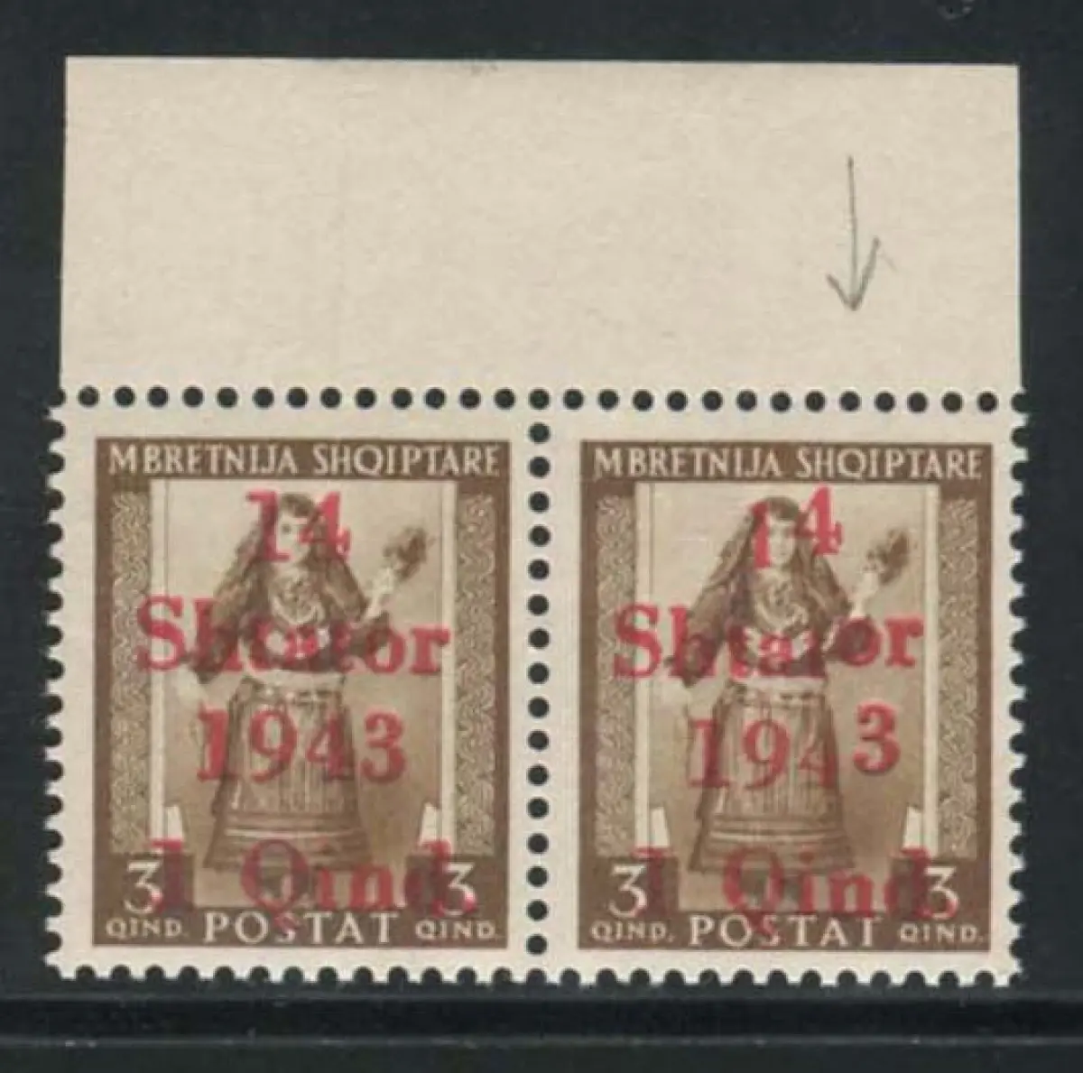 Albanien Occ. Deutsch - 1 Q. auf 3 braunes Exemplar rechts mit Sorten 4 von 14 Vollgummi - Albanien Occ. Deutsch - 1 q. von 3 braun Nr. 1ec waagerechtes Paar b. von f. das rechte Exemplar mit Sorten 4 von 14, Gold von Shtator und 3 von 1943 nach oben verschoben - Interessant - Kat. 495 Code 811/7