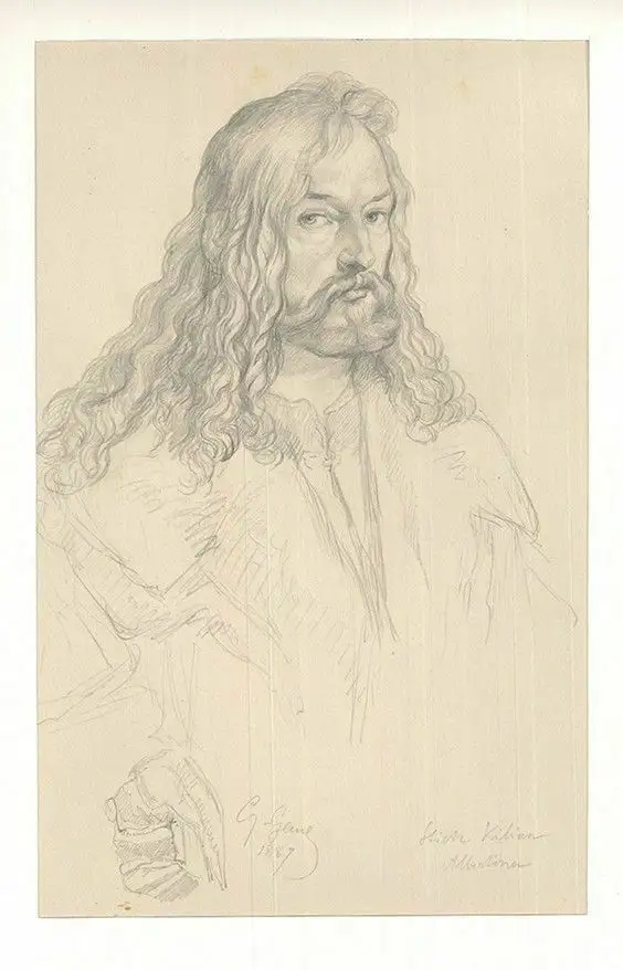 Bemerkungen: vgl. Thieme-B., XIII, 274 - Teilausgeführte Bleistift-Portraitzeichnung des österreichischen Malers Gustav Gaul (1836-1888) nach dem Kupferstich (1608) von Lucas Kilian (1579-1637), die Albrecht Dürer zeigt. Gustav Gaul war der Sohn von Franz Gaul (1802-1876), der auch sein erster Lehrer war. Gaul besuchte die Wiener Kunstakademie und war Schüler bei Carl Rahl (1812-1865), dessen Stil er lange treu blieb. Er unternahm zahlreiche Studienreise so u.a. 1853 nach Italien (zusammen mit Rahl), 1855 nach Frankreich, in die Niederlande und nach Deutschland. Am unteren Rand signiert "G. Gaul, 1887" und bezeichnet " Stich Kilian Albertina".