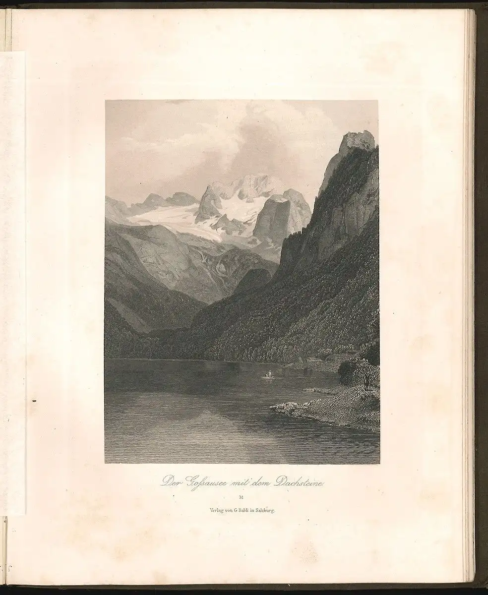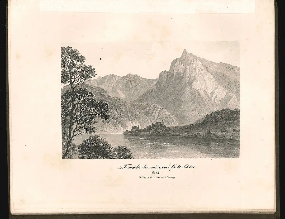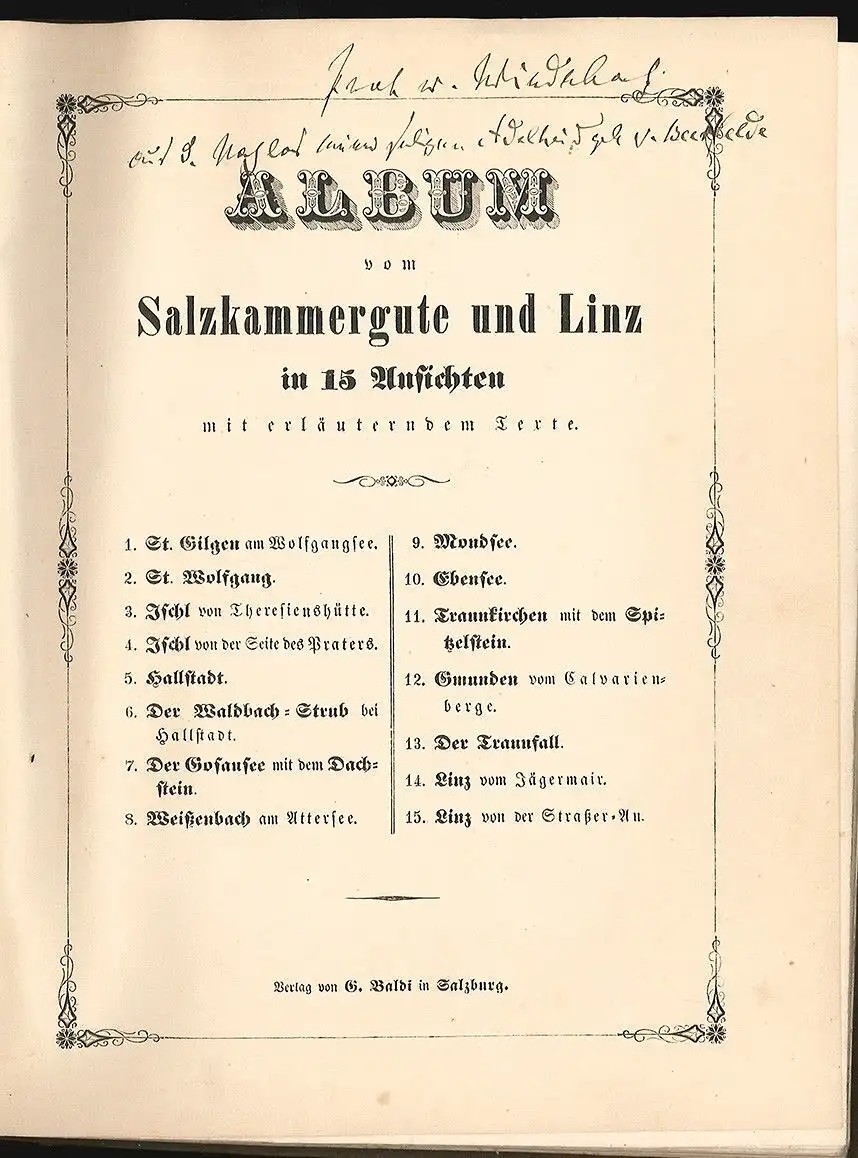 Bemerkungen: Nebehay-W. 69 - Enthält folgende Ansichten: St. Gilgen, St. Wolfgang, Ischl von Theresienhütte, Ischl von der Seite des Praters, Hallstadt, Der Waldbach-Strub, Der Gosausee mit dem Dachstein, Weißenbach, Mondsee, Ebensee, Traunkirchen mit dem Spitzelstein, Gmunden, Der Traunfall, Linz vom Jägermair, Linz von der Strraßer-Au.