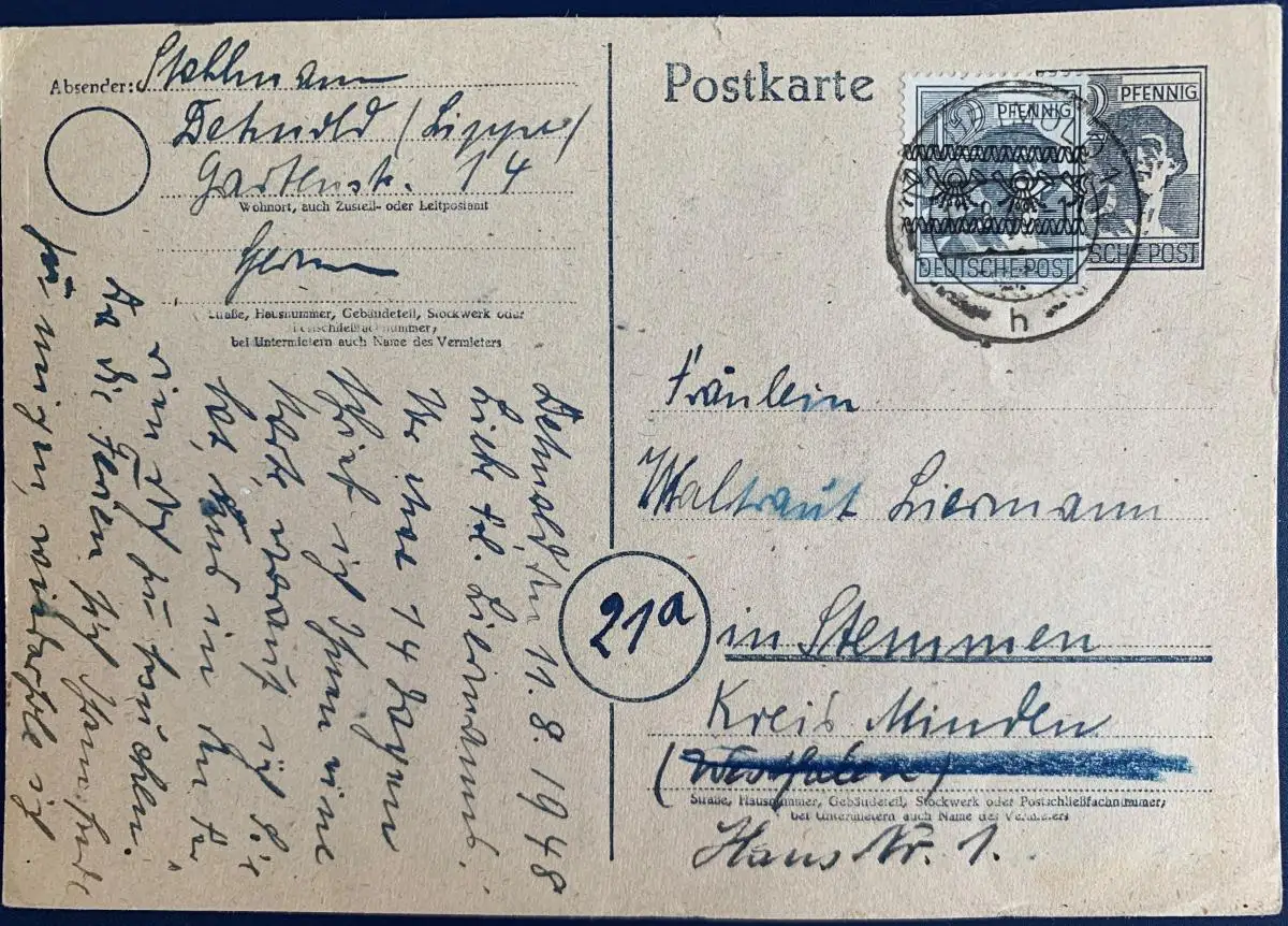 Zusatzfrankatur Mi.Nr. 40 I (Bandaufdruck), gelaufen mit Poststempel vom 12.08.1948 von Detmold nach Stemmen (Kreis Minden).