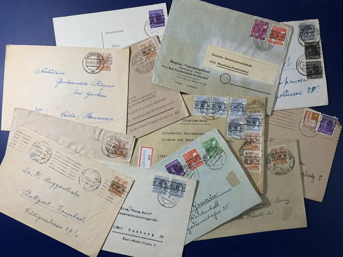 12 Bedarfsbriefe (Einschreiben, Mehrfachfrankaturen), alle in den Monaten nach der Währungsreform gelaufen. Mit Netz- oder Bandaufdrucken, manche Briefe mit Gebrauchsspuren, überwiegend gut erhalten. Der Preis gilt für alle Briefe zusammen!