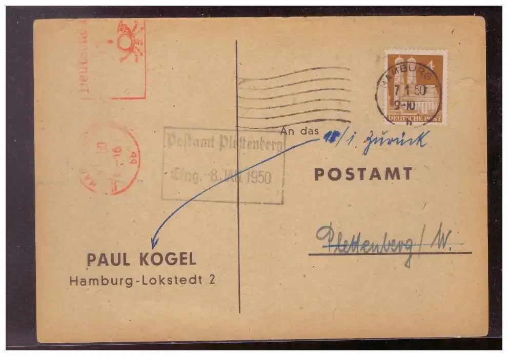 Bizone (009445) Postkarte Teilbarfrankatur Paul Kogel, Hamburg gelaufen 7.1.1950