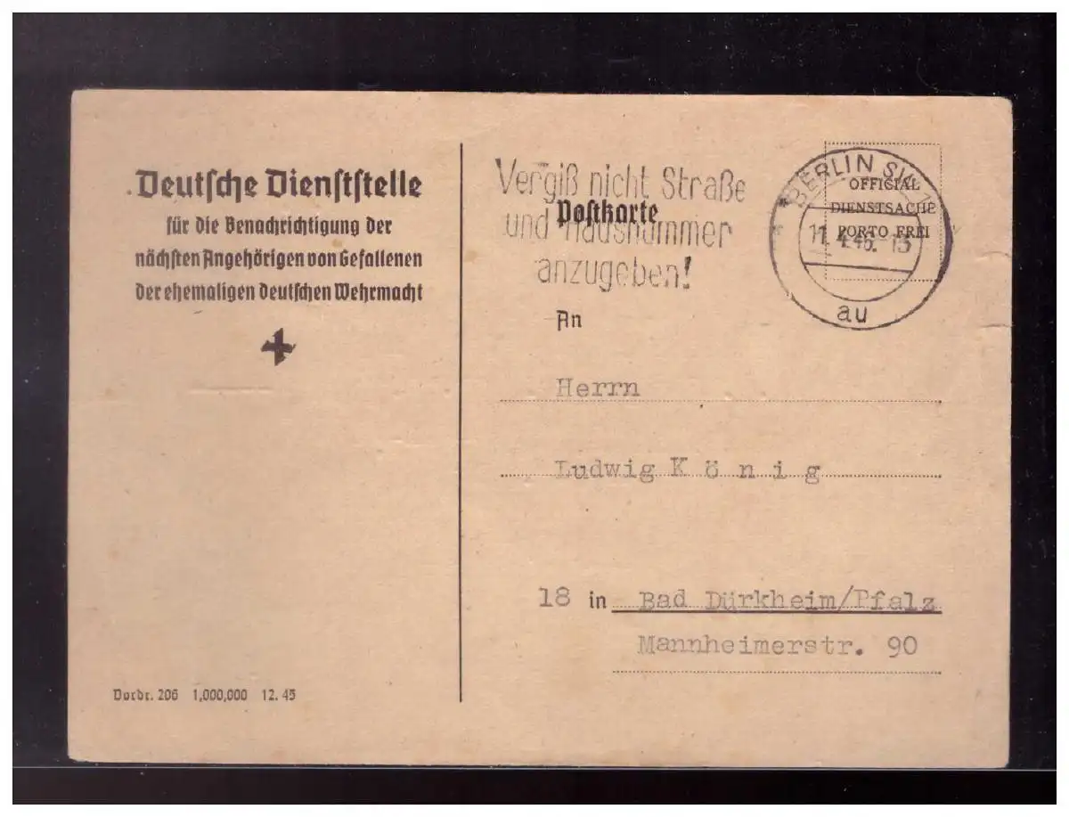 Bizone (022904) Postkarte Deutsche Dienststelle über genachrichtigung des Todes eines ehemaligen Deutschen Wehrmacht