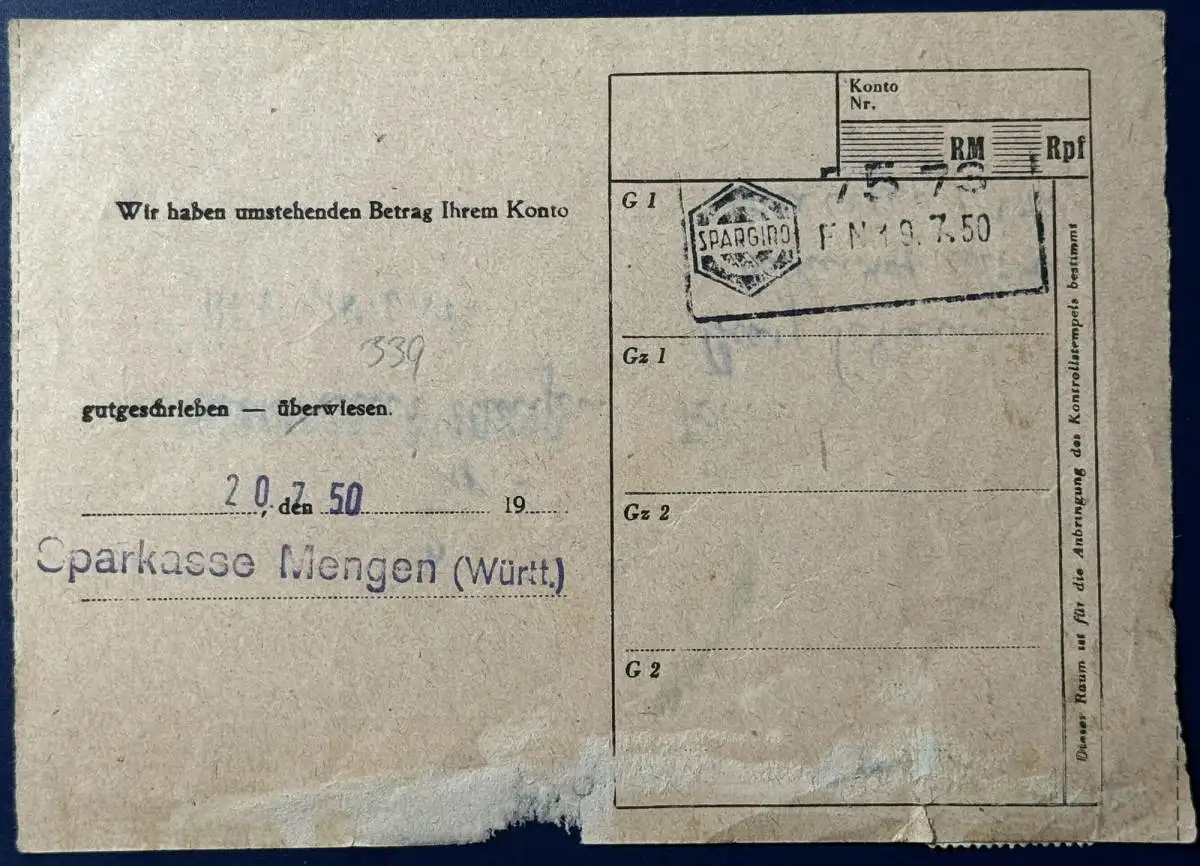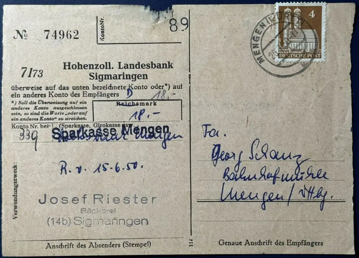 Überweisungsauftrag, 1950, frankiert mit Mi.Nr.74, gelaufen mit Poststempel vom 20.07.1950 in Mengen (Württemberg), gutgeschriebener Betrag auf der Rückseite quittiert. Beleg hat Gebrauchsspuren, ansonsten gut erhalten.