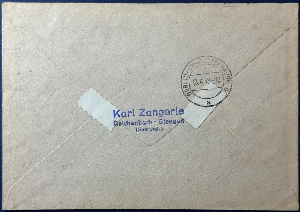 Einschreiben mit Landpoststempel, Mischfrankatur, bestehend aus Mi.Nr. 6 (2x) und Mi.Nr. 15, gelaufen mit Poststempel vom 07.08.1948 von Reichenbach-Steegen über Kaiserslautern nach Berlin-Charlottenburg. Leichte Vergilbung am Oberrand, ansonsten ist der Brief gut erhalten.