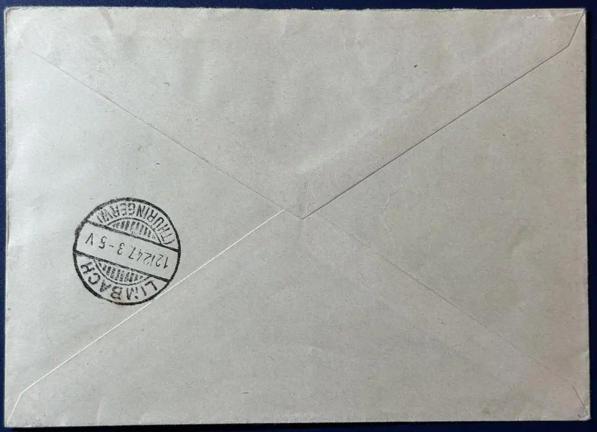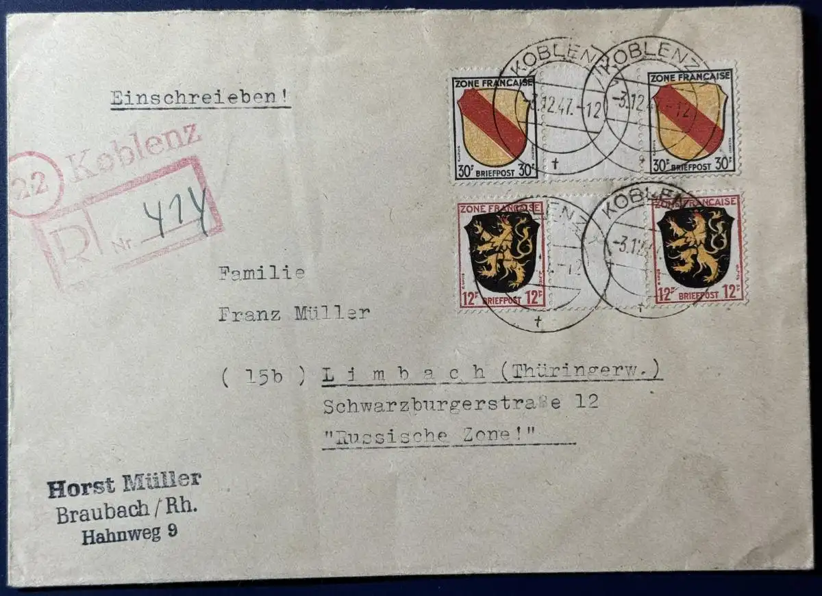 Einschreiben, Franz.Zone Allgemeine Ausgabe, 1947, Mehrfachfrankatur, bestehend aus Zwischenstegpaaren der Mi.Nr. 6 + 10, gelaufen mit Poststempel vom 03.12.1947 von Braubach über Koblenz nach Limbach/Thüringen, Brief ist gut erhalten, saubere Stempel (siehe Scan).