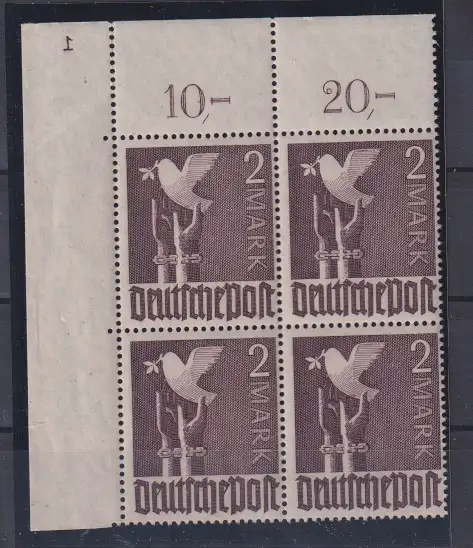 Kontrollrat Friedenstaube MiNo. 960 ** Eck-4er-Bl. mit F1 Pl.No. 1 sowie Plattenrand dgz