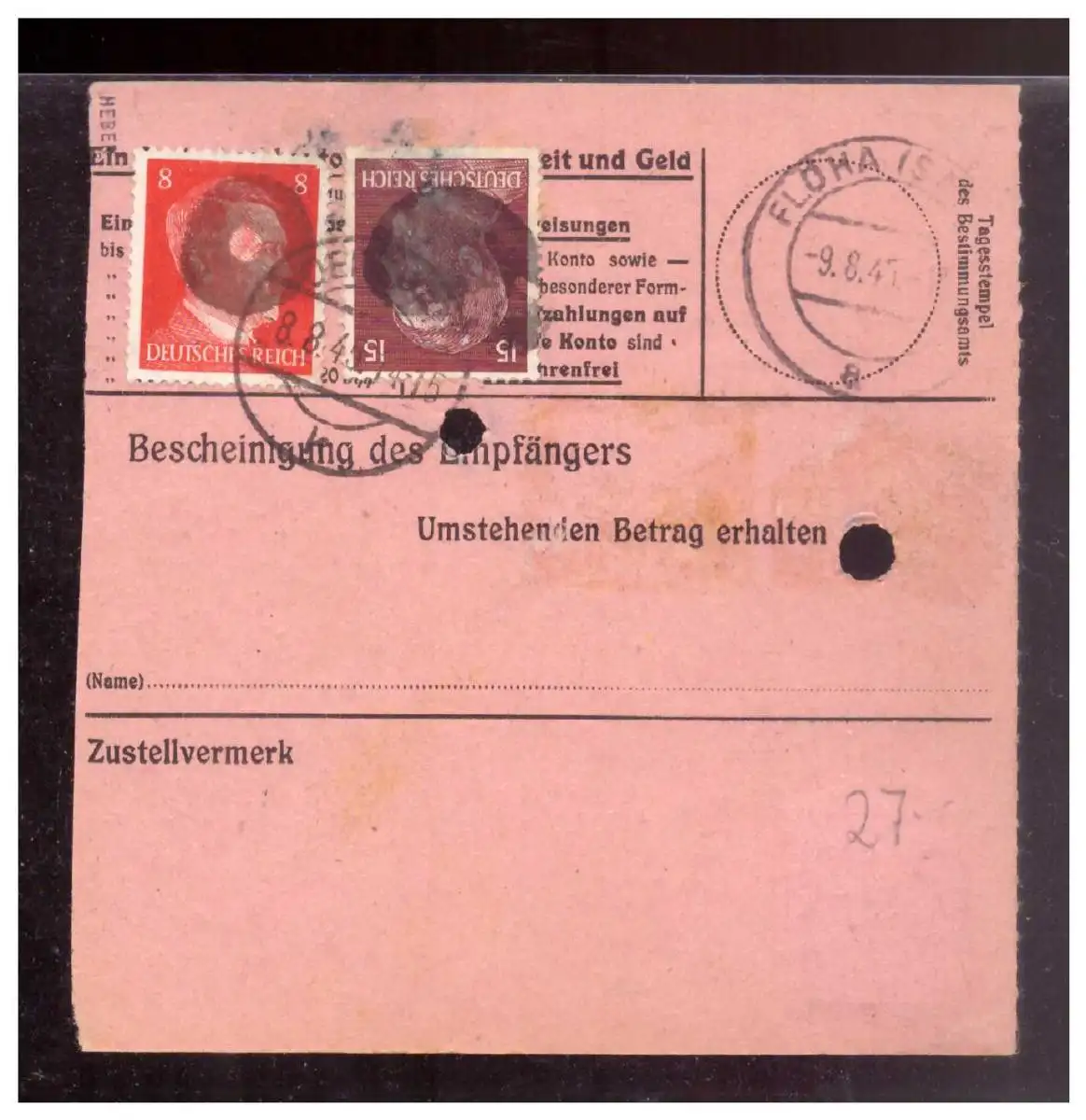 SBZ (022385) Postanweisung, Aktengelocht Sächsische Schwärzungen 2x AP786I, AP789I, gelaufen Oederan