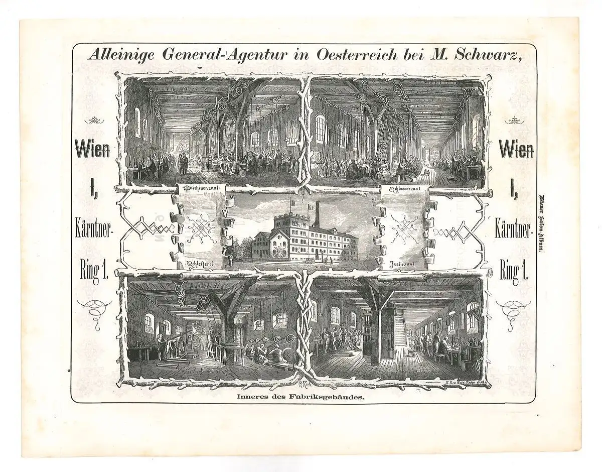 ArtikeldetailsAlleinige General-Agentur in Oesterreich bei M. Schwarz., Wien I, Kärntner-Ring 1. Inneres des Fabrikgebäudes. Maschinensaal. Schleiferei. Justirsaal. [WIEN] -