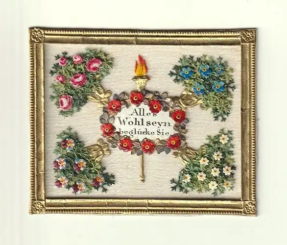o. O. [um 1820]. 5, 5 x 6, 7 cm (Gesamtgr.). Kunstbillet mit gestochenem Textmedaillon, farb. plastisch geprägten Blumenbouquets und Fackel als Collage auf Gaze, gerahmt mit vergoldeten Messingblechleisten. In sehr gutem Zustand.