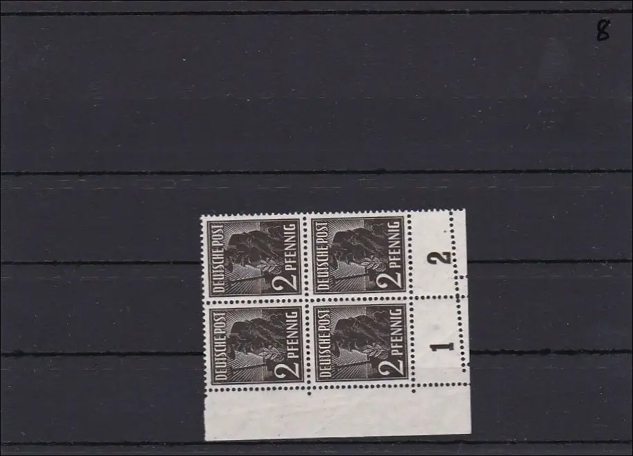 Alliierte Zone, 943 Viererblock linke untere Ecke mit Doppelzähnung **