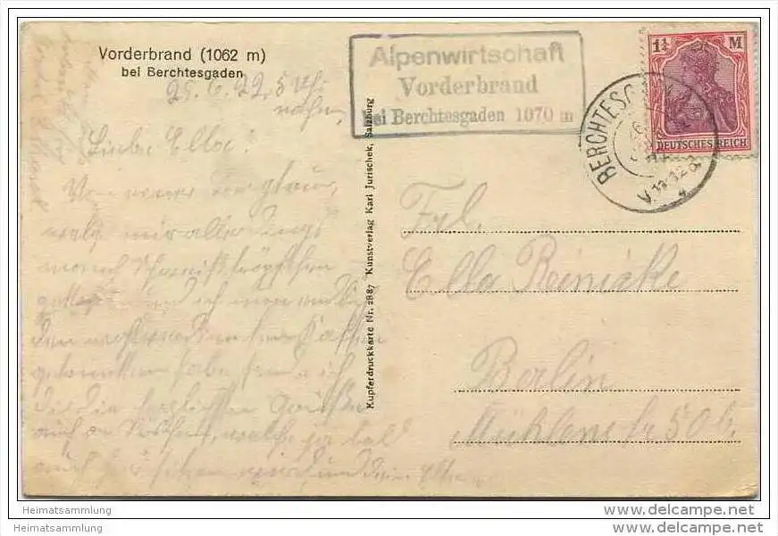 Alpenwirtschaft Vorderbrand bei Berchtesgaden - Verlag Karl Jurischek Salzburg (E10329) gel. 1922