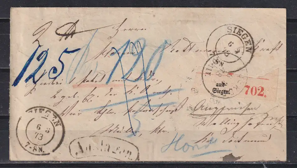 Preussen Auslagenbrief Siegen 6.3.73 mit Klebezettel " aus Siegen 702" mit diversen Postvermerken, rs. etwas rauh geöffnet