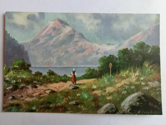 Alte AK Gemäldekarte Berge See Frau [aH903]