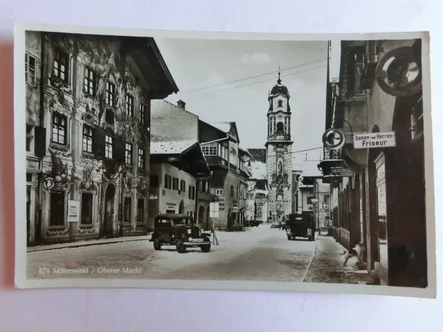 Alte AK Mittenwald Oberer Markt Autos Friseur [aJ873]