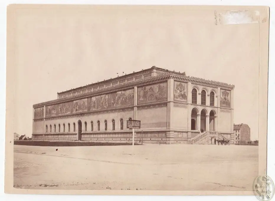 Bemerkungen: Auf der Rückseite eine weitere Photographie: Die Neue Pinakothek. 1944 wurde das Gebäude der Neuen Pinakothek bei anglo-amerikanischen Luftangriffen durch Brandbomben schwer beschädigt. Fünf Jahre später endete die erste Etappe der Geschichte der Neuen Pinakothek mit der Entscheidung, die Ruine abzureißen. Das Photo weist am oberen rechten Eck die Reste eines Etiketts auf.