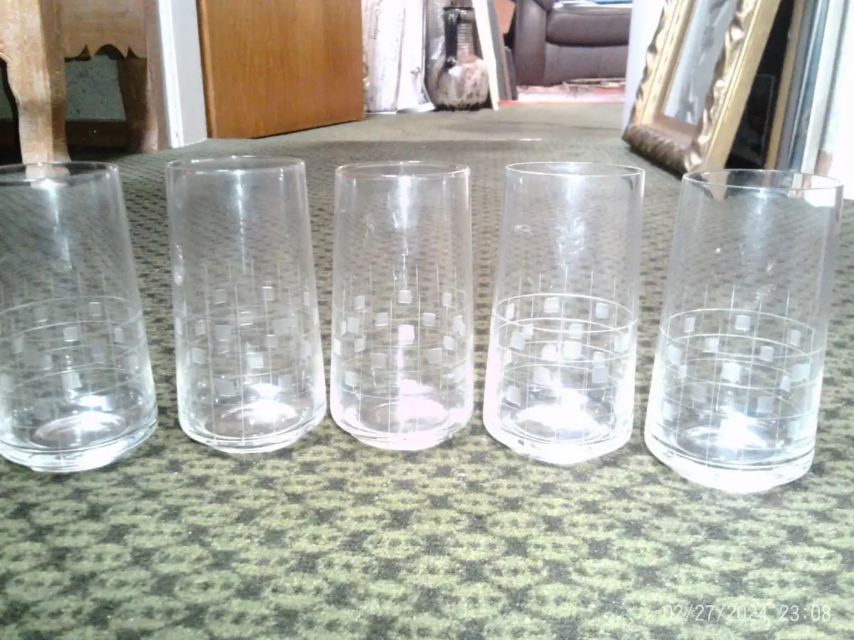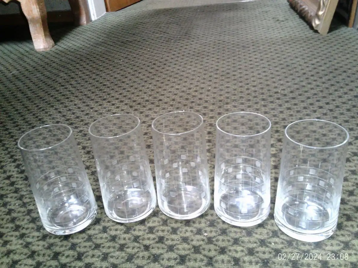 Libbey Sampler Set 5 konische Kristallgläser 1950 Jahre kubistisches Schliffdekor wohl Bier oder Saftgläser Dekor Anchor Hocking Kubist