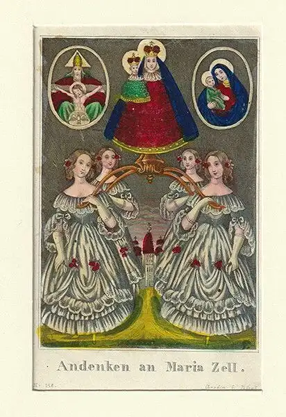 Bemerkungen: Vier junge Frauen halten das Gnadenbild "Magna Mater Austriae", zwischen ihnen im Hintergrund ist die Basilika zu sehen.