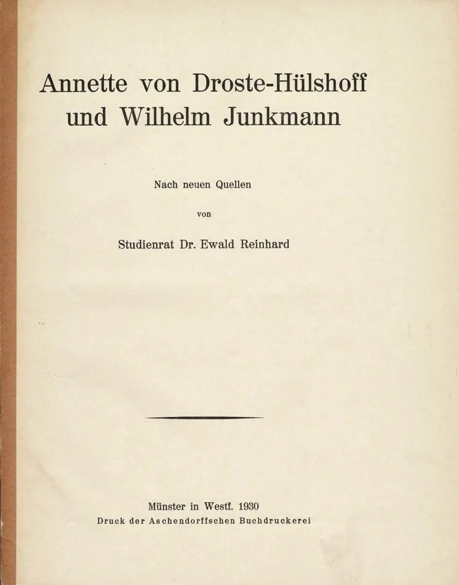 Annette von Droste-Hülshoff und Wilhelm Junkmann. Nach neuen Quellen [Reihe Programmabhandlungen des Staatl. Paulinischen Gymnasiums, Münster i. W.] + Doppelseite aus dem Münsterischen Anzeiger von 1912 zu Droste-Hülshoff.